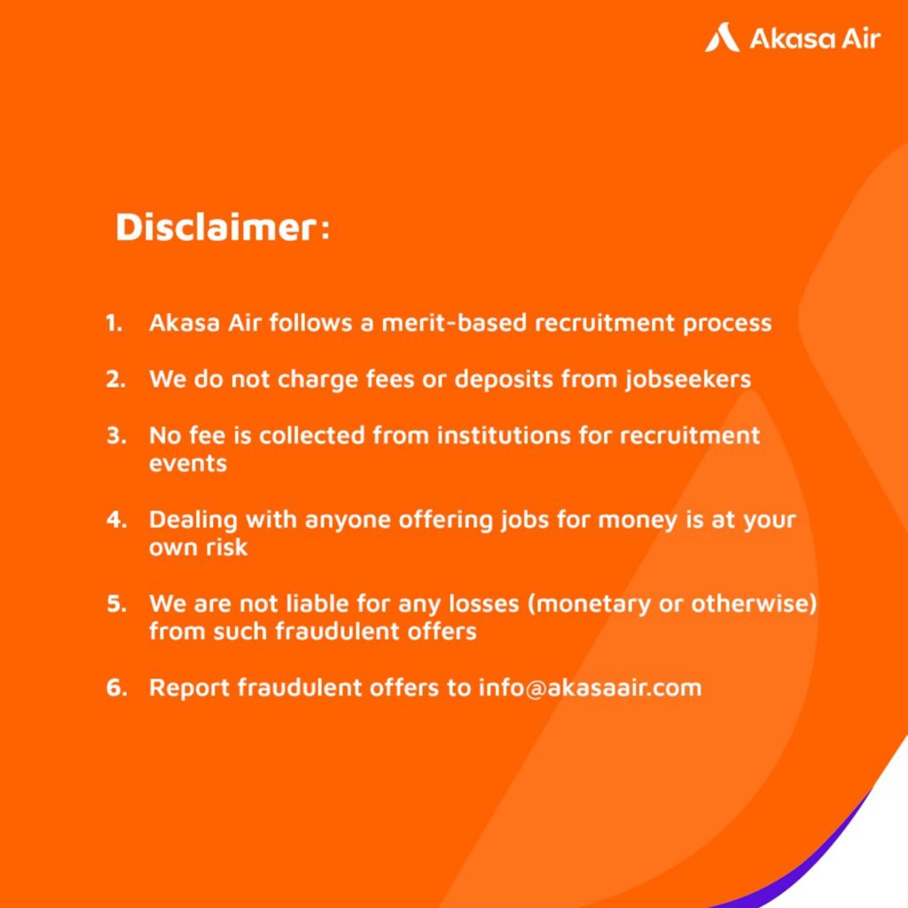 Note: Akasa Air does not charge any fees or deposits for job applications. Candidates are advised to apply only through official channels.