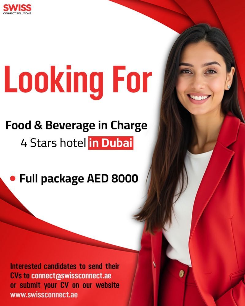 Swiss Connect Solutions is currently hiring for a 4-star hotel in Dubai, UAE, and we are looking for a Food & Beverage In Charge to join the team. If you have a strong background in F&B operations, leadership skills, and a passion for hospitality, this is an excellent opportunity for you to grow your career in Dubai’s vibrant hotel industry.