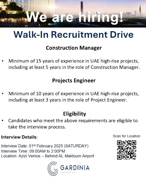 | Construction Manager | 15+ years (5 years as Construction Manager) | Manage high-rise projects, coordinate teams, ensure project delivery. | 1st Feb 2025, 9:00 AM – 2:00 PM | Azizi Venice, Dubai South |
