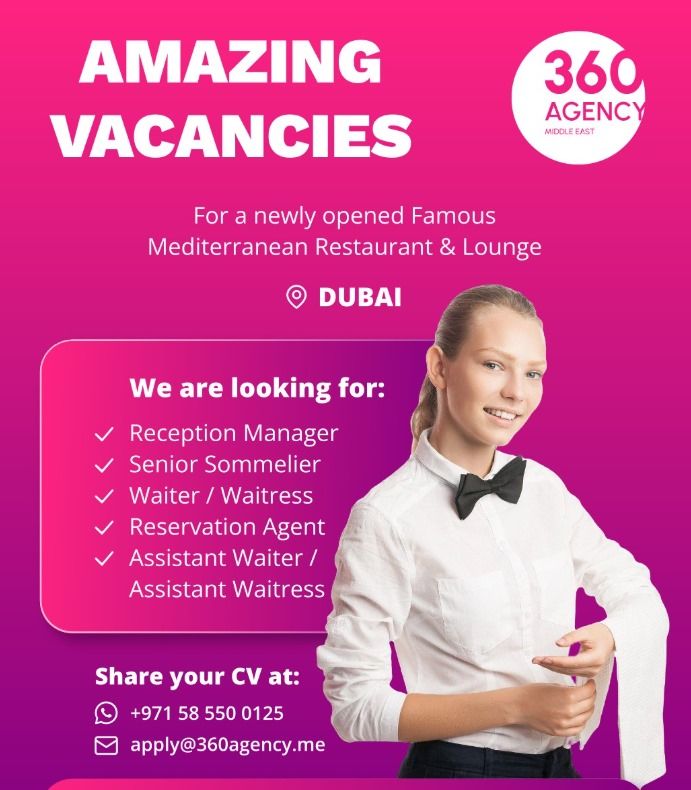 A newly opened famous Mediterranean Restaurant & Lounge in Dubai is hiring talented professionals to join its dynamic team. If you have a passion for hospitality and customer service, this is your opportunity to work in a high-end, fast-paced dining environment.