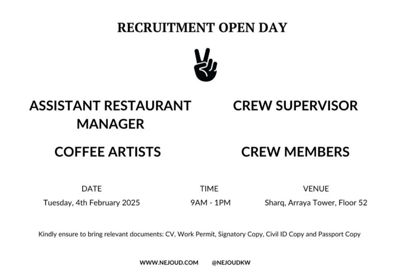 Nejoud Restaurant Management is excited to invite hospitality professionals to our Recruitment Open Day on Tuesday, 4th February 2025, from 9:00 AM to 1:00 PM at Sharq, Arraya Tower, Floor 52, Kuwait.
